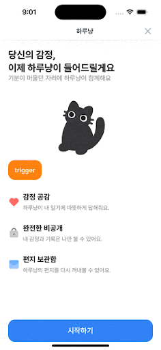 하루냥은 "하루를 위로해주는 모바일 속 작은 내 친구" 콘셉트의 AI 기반 감정 일기 앱입니다. 사용자가 그날의 날씨/감정/일기 작성하면, 하루냥은 기록 내용에 맞춰 공감과 위로의 편지를 전해 감정 기록을 지속하게 만드는 경험을 제공합니다.